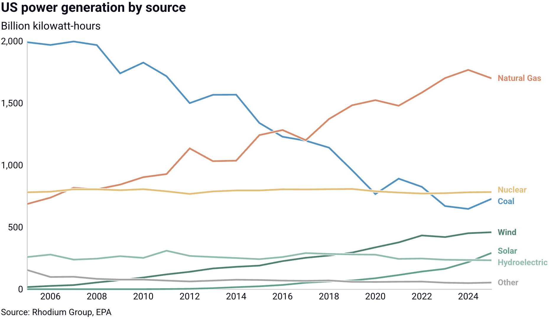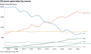 The fastest-growing power generation source in 2025 was solar, whose generation increased by 34% and surpassed hydroelectricity. Federal subsidies are being phased out for renewable energy sources beginning mid-year 2026, which may slow the pace of solar additions. Natural gas remained the largest source of electricity, with a 40% share.