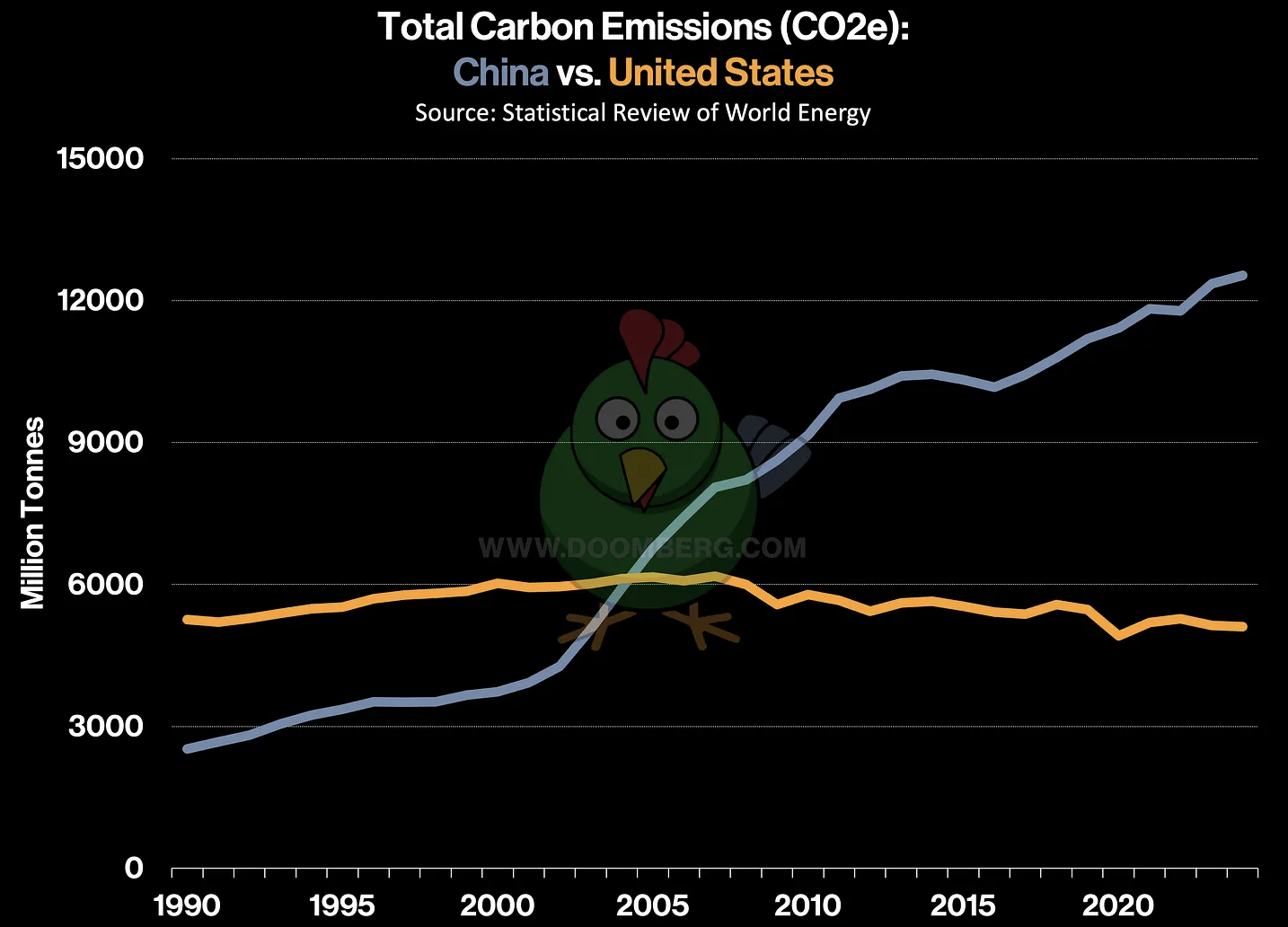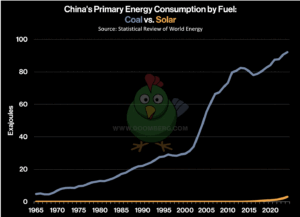 The Statistical Review of World Energy reports that coal accounted for 58% of China’s primary energy consumption in 2024. Oil was at 20% and natural gas at 10%. That means that 88% of China’s energy came from fossil fuels. Carbon-free energy (nuclear, hydroelectric, solar, wind, and most other renewables) only provided 12%. Since 2000, China has more than tripled its coal consumption and now uses more coal than the rest of the world’s combined usage, burning 56% of the world’s coal. As Doomberg points out, China consumes almost 20 times the combined consumption of coal by the 27 member states of the European Union, based on 2024 data.