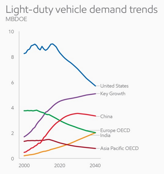 The amount of fuel used by light duty vehicles declines in the United States and in the countries that make up the Organization of Economic Cooperation and Development (OECD). In China, light duty vehicle demand increases, and then flattens as fuel economy improves and car penetration slows. (See chart below.) Exxon expects light duty vehicle demand outside the OECD and China to grow about 50 percent; the non-OECD share of global light-duty demand increases from 40 percent today to 60 percent in 2040 in Exxon’s forecast.