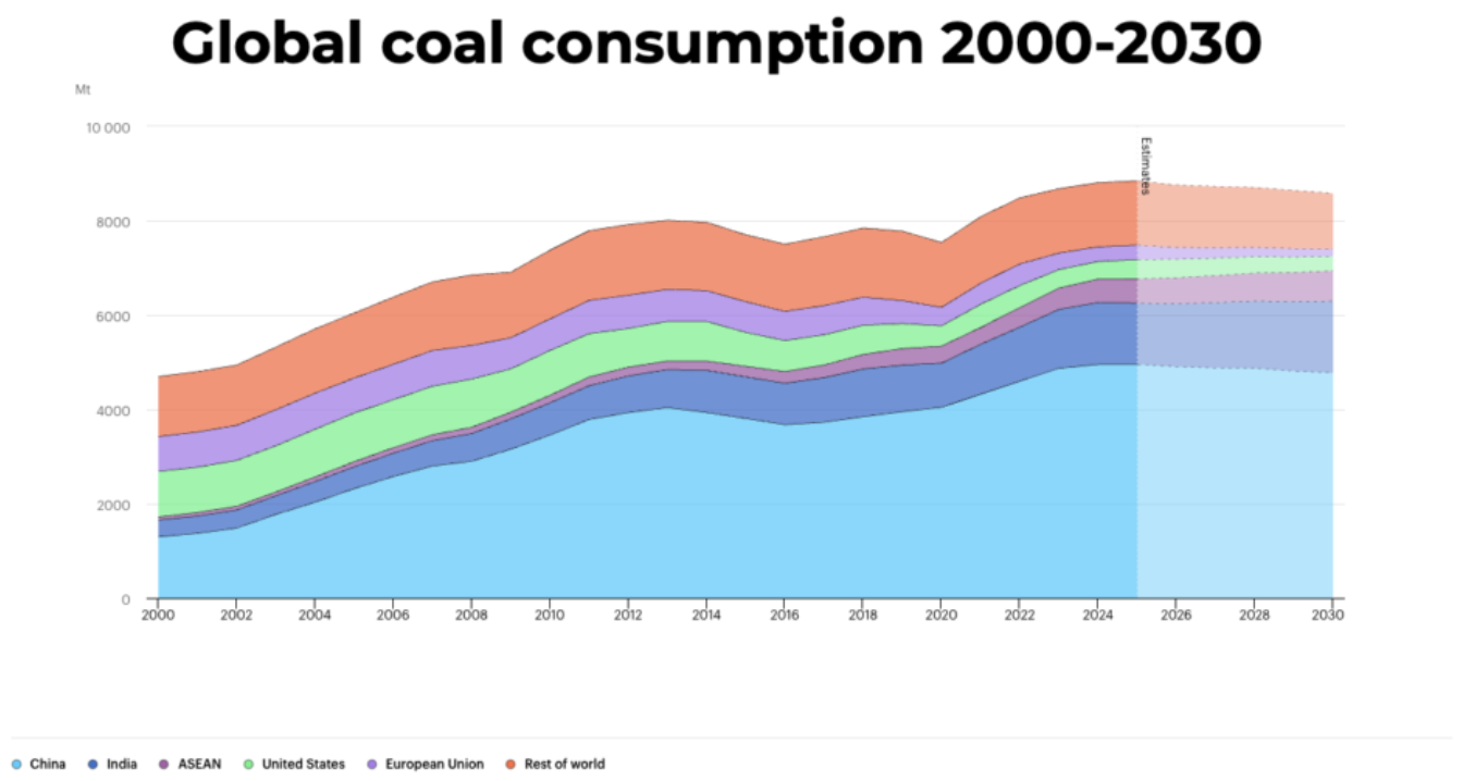 China consumes more coal than the rest of the world combined to fuel its industrial base and provide energy for its residents. China has more coal power plants than the entire electric generating fleet of the United States from all sources, and is still building state-of-the-art coal plants with little regulation affecting their cost. India is the main source of net coal demand growth through 2030, due to growth in electricity demand, cement, steel, and coal-based industrial processes. Coal generates over 74% of India’s electricity, having increased 3.5% in FY25. India’s Ministry of Coal has set a target to increase domestic coal production by 42% over the next five years. Southeast Asia has the fastest growth rate, led by new coal power and metals processing. Asian coal demand combined has offset most declines in coal demand in advanced economies.