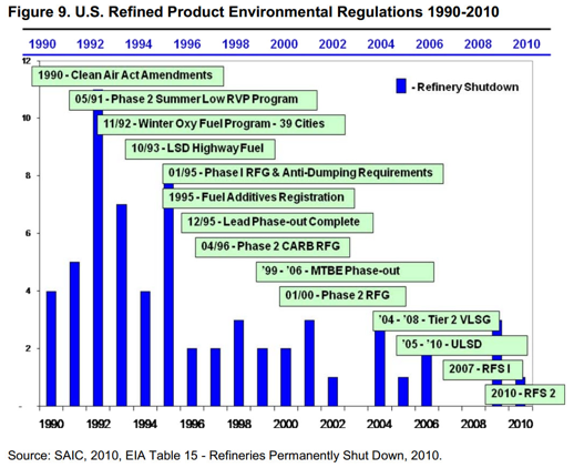 According to a March 2011 Department of Energy report, in the past 20 years, federal regulations were a significant factor in the closing of 66 U.S. refineries. (See chart below.) Refinery closures and the recession have led to a loss of over 3,000 direct jobs and 506,000 barrels per day decrease in refining capacity.