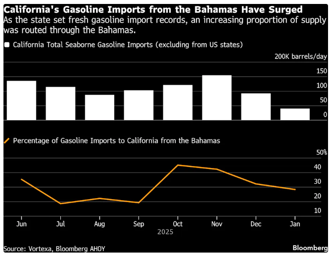 California requires a specialized boutique blend of gasoline to fuel its vehicles due to its environmental policies. According to Bloomberg, refineries in Asia are producing gasoline blend stock at the grade required by California, and the product can be shipped without transiting the Panama Canal and paying its transit fees, unlike imports coming from the Bahamas. Both India and South Korea supplied more gasoline to California last year than did the Bahamas. Removal of U.S. sanctions on Venezuela has resulted in an increase in regional freight prices, making foreign-flagged ships only about $1 cheaper than U.S. ships, compared to nearly $4 a barrel cheaper before the Maduro raid. If freight costs continue to rise, shipments of U.S. gasoline may not be able to compete with supplies from South Korea or India, given the Jones Act restrictions.
