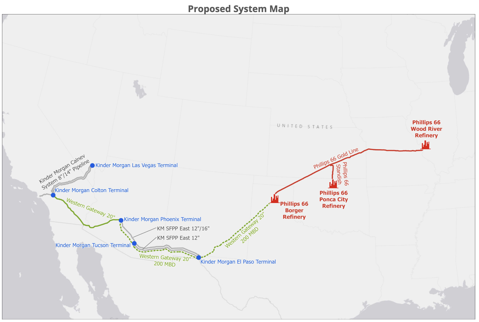 Via Kinder Morgan, the project would combine a new-build pipeline from Borger, Texas, to Phoenix, Arizona, with a reversal of Kinder Morgan’s existing Santa Fe Pacific Products. The West Line (which currently flows from Colton, California, to Phoenix) will enable east-to-west flows into California. The plans also include the Phillips 66 Gold Pipeline, which currently flows from Borger to St. Louis, to also be reversed to move gasoline, diesel, and jet fuel from the Midcontinent toward Borger and into the Western Gateway system. The Western Gateway Pipeline is designed to be approximately 1,300 miles long.