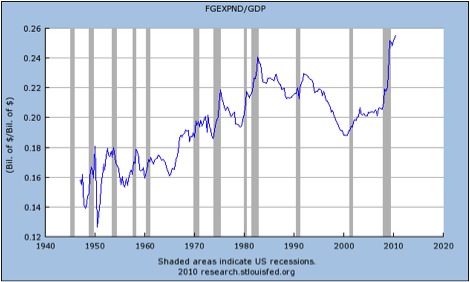 As this last chart illustrates, currently federal spending constitutes about a quarter of the entire U.S. economy, a shocking level not seen since World War II. Federal spending was far lower, both in absolute terms but also as a share of GDP, during the 1990s.