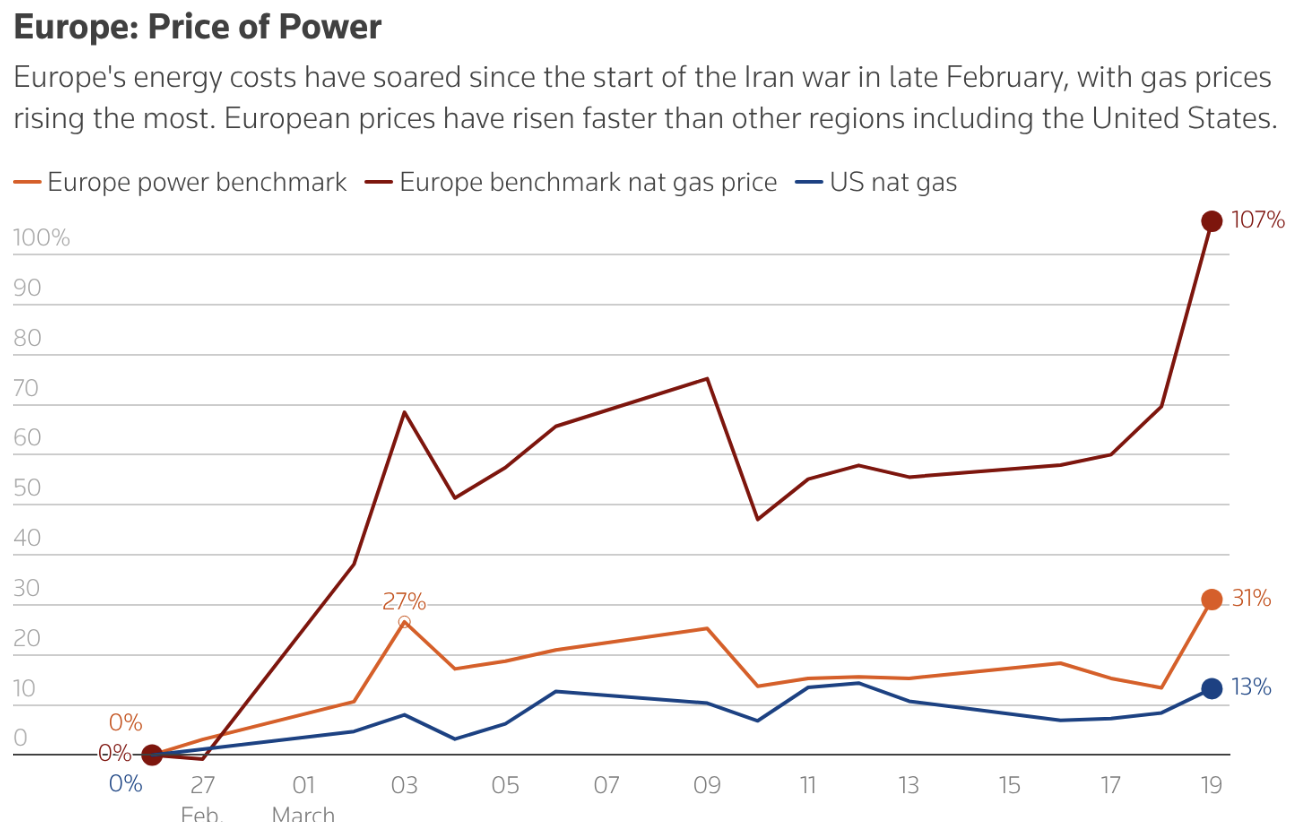 U.S. energy abundance is protecting American consumers from the severe price shocks seen in Europe due to the conflict with Iran. European energy prices were high even before the conflict began, largely due to climate regulations and subsidies for renewable energy technologies that crowd out reliable sources. How long prices will remain elevated depends on how long the Strait of Hormuz remains effectively closed. Once opened, it will take some time for producers to gear up production.