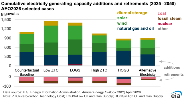 The Energy Information Administration (EIA) released its Annual Energy Outlook 2026 on April 8 with a different outlook for the generating sector compared to last year’s outlook. The 2026 outlook incorporates laws and regulations in effect as of December 2025 — mainly the One Big Beautiful Bill Act, signed in July 2025. That law phases out subsidies for intermittent wind and solar technologies.