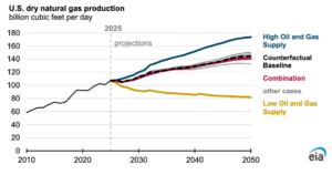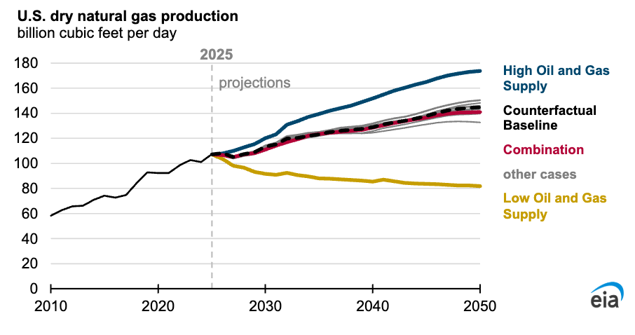 Natural gas demand not only increases due to increases in the generating sector but also because of expanding liquefied natural gas (LNG) exports. U.S. dry gas production increases up to 40% through 2050 from 2025 levels among the cases. The EIA projects LNG exports will rise from about 15 billion cubic feet per day in 2025 to more than 30 billion cubic feet per day by 2050.