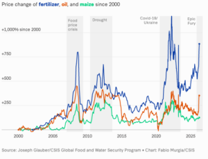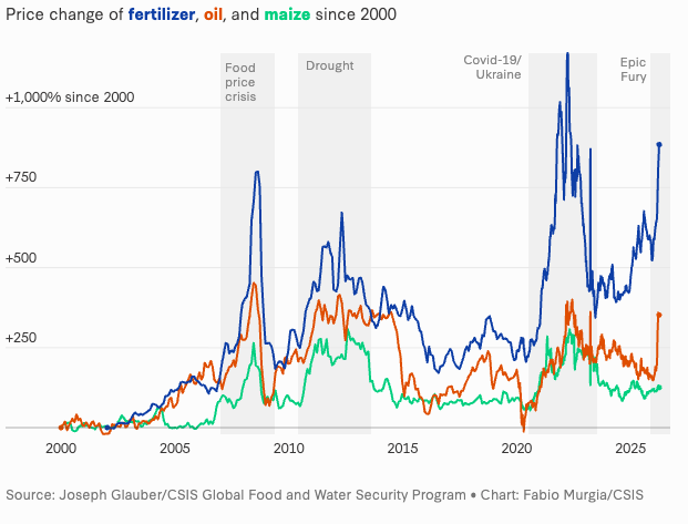 The war with Iran has resulted in about 13 million barrels per day of oil unavailable to global markets, as well as other disruptions in key commodities such as fertilizer. Just as planting season is starting in many countries, fertilizer prices have risen, as about a third of the global fertilizer trade transits through the Strait of Hormuz. Nitrogen‑intensive crops such as corn and wheat will be affected first, with higher feed costs eventually spilling over to other food products, including bread, poultry, and eggs. Fertilizer production is energy-intensive, relying heavily on natural gas as a feedstock, with energy making up as much as 70% of production costs. About 20% of the global natural gas trade has been affected by the closure of the strait.