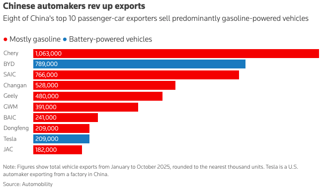 As reported by Reuters, Chery has emerged as China’s largest auto exporter, with global sales surging from 730,000 vehicles in 2020 to 2.6 million in 2024, driven largely by gasoline models that account for about four-fifths of its volume. Five other state-owned manufacturers and two private firms — Geely and Great Wall Motor — also rank among China’s top 10 exporters, most of them selling more gasoline vehicles than electric ones. China’s gasoline-vehicle exports are expected to exceed 4.3 million units this year, representing nearly two-thirds of total shipments, with only Tesla and BYD focused exclusively on battery-powered or plug-in models. BYD, now China’s second-largest exporter, has begun tilting the mix toward electrified vehicles, even as an oversupply of domestic brands makes exports central to industry growth. Global automakers increasingly view Chinese competitors as a major threat, prompting Volkswagen to consider exporting China-built cars and General Motors to pledge it will meet the challenge with competitive technology and costs.