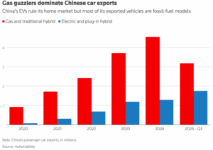 China originally built its gasoline-vehicle sector by drawing on foreign automakers’ technology through joint ventures. It is now exporting large volumes of gasoline cars into overseas markets, while restricting such models at home. The export push is being led by state-owned legacy manufacturers, including SAIC, BAIC, Dongfeng, and Changan — companies that for decades depended on joint ventures with foreign partners for profits and engineering know-how after those relationships were launched in the 1980s.