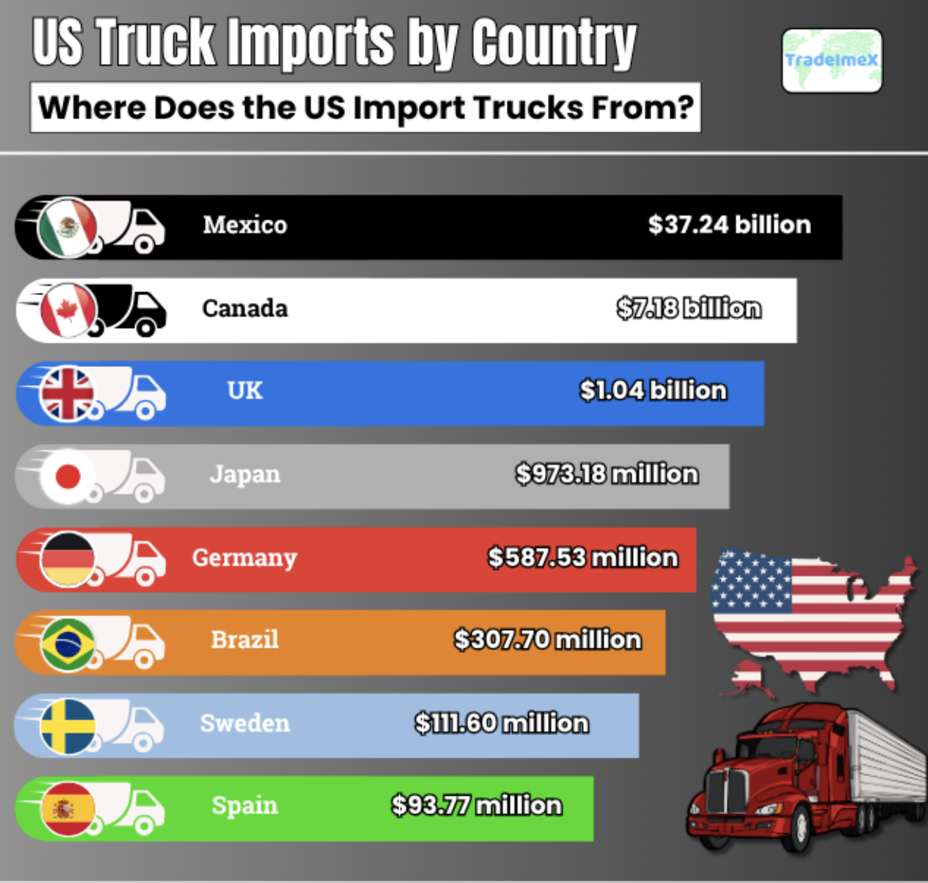 In 2024, the United States imported around a record high $47.8 billion worth of trucks, including both finished vehicles and specialized work trucks — a growth rate of around 9% compared to 2023 — with Mexico and Canada providing most of those imports, as depicted below.