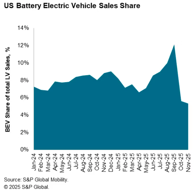 Trump’s One Big Beautiful Bill Act repealed financial penalties for automakers that do not meet fuel efficiency requirements and ended the EV tax credit on September 30. Sales of new electric vehicles have plunged since then. In November, electric vehicles accounted for 5.3% of U.S. new-car and light-truck sales — less than half the record high in September. Ford’s November unit sales of its Mustang Mach-E were down 49% compared to the same month in 2024. Hyundai’s Ioniq 5 was down 59%. The president also signed a law to block California from enforcing a ban on new gas-powered car sales — a waiver that the state received under the Biden administration that allowed it to set its own rule and that other states could follow.