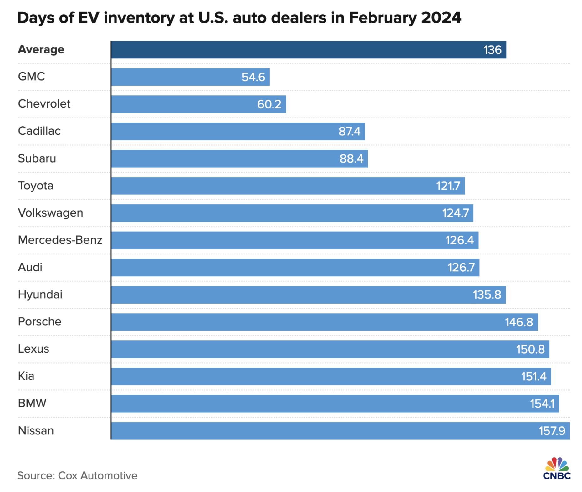 The available inventory of electric vehicles in the United States, measured in days’ supply, has soared to 136 days, according to Cox Automotive. That compares to the overall U.S. industry at a 78 days’ supply of new vehicles. The data excludes Tesla, Rivian and other automakers that sell directly to consumers rather than through franchised dealers. The slower adoption of electric vehicles has led to price cuts or discounts on several models such as the Ford Mustang Mach-E, Tesla Model Y and the Nissan Ariya. According to Nissan, cuts of up to $6,000 will “improve the model’s competitiveness and ensure we are delivering maximum value to our customers.”