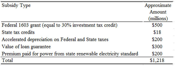 Unfortunately, the $30 million in state tax credits are merely “frosting on a multi-layered cake of federal, state and local subsidies,” as The Oregonian put it. A 2010 internal Obama administration memo showed that, at the time of the memo’s issuance, the Shepherds Flat facility was slated to receive more than $1.2 billion in subsidies for a $1.9 billion project—about 64 percent of the total cost—including a partial loan guarantee from the U.S. Department of Energy (DOE). The following table from the Obama administration memo totals these various subsidies: