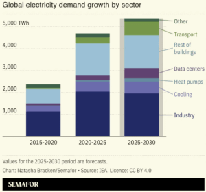 The International Energy Agency (IEA) expects average electricity demand worldwide to grow by more than 3.5% a year through this decade, driven by industry, AI data centers, air conditioning, and electric vehicles.